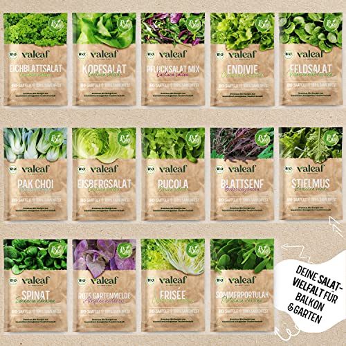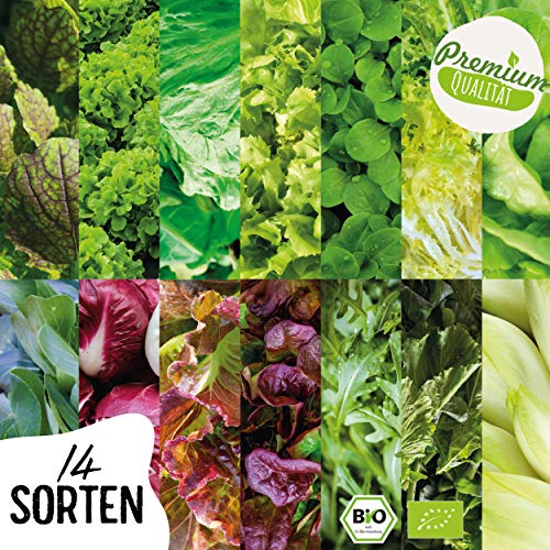 BIO Salat Samen Set – 14 Sorten Salatsamen aus biologischem Anbau I samenfestes Salat Saatgut I Bio Salat Set für Balkon, Garten und Hochbeet I 14er Saatgut Gemüse inkl. Gemüsesamen alte Sorten