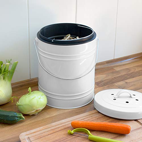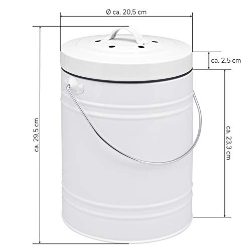 LIEFERUMFANG: Komposteimer Metall lackiert, ca. Ø 20,5 x 29,5 cm H ? Inneneimer Kunststoff, ca. 5 Liter Fassungsvermögen, ca. Ø 18,5 x 20,5 cm H ? 4 Stück Aktivkohlefilter ca. Ø 10 cm