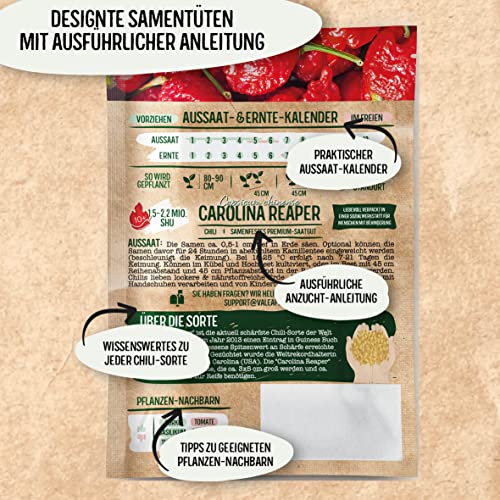 🌶 Chilli Anbau mit Premium Qualität I inkl. Anleitung zur Samen Zucht & weiteren Infos in der beiliegenden Broschüre. Die Samen sind keimsicher in Keimschutzbeuteln verpackt für extra lange Haltbarkeit. Unser Premium-Saatgut ist zertifiziert und die Sets werden liebevoll in Deutschland hergestellt.