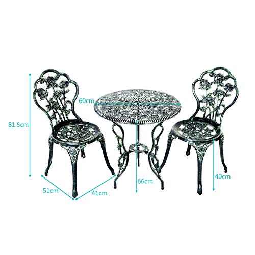 【Solide Konstruktion aus Gegossenem Eisen und Aluminium】Hergestellt aus gegossenem Aluminium und gegossenem Eisen, ist dieses 3-teilige Bistro Set widerstandsfähig und stabil genug, um Ihnen über einen langen Zeitraum hinweg gute Dienste zu erweisen. Zusätzlich besitzt der Stuhl, mit seinem einzigartigen Stuhlbeindesign und dem festen Material, eine sehr große Kapazität für Gewicht und somit eine hohe Tragkraft.