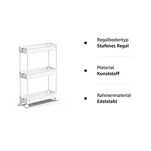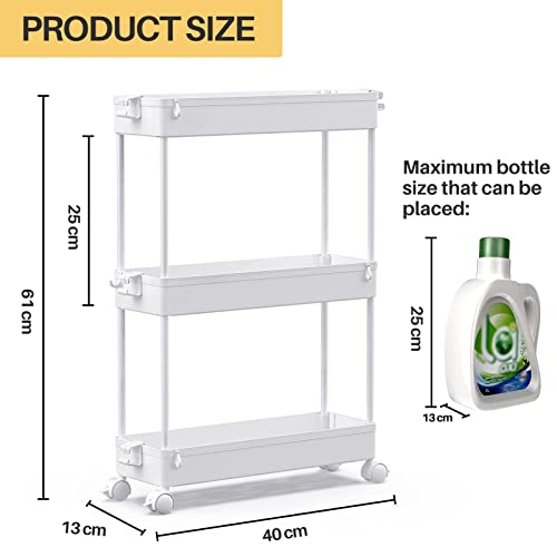 【Große Kapazität und flexibel】Der schlanke 3-stufige Aufbewahrungswagen ist perfekt für eine enge Raumnutzung zu Hause konzipiert. Dieser rollende Küchenwagen ist ideal für Küche, Bad, Garage, Waschküche, Büro, Wohnheim, Bibliotheken oder zwischen Waschmaschine und Trockner. Einfach zu platzieren und bewegen. Größe: 13 x 61 x 40 cm.
