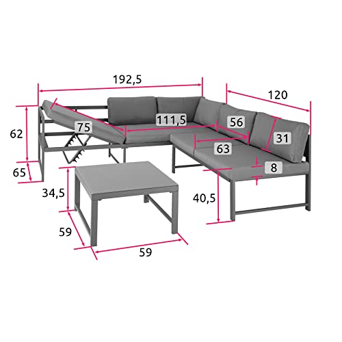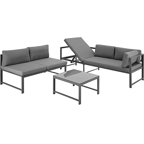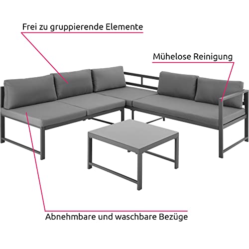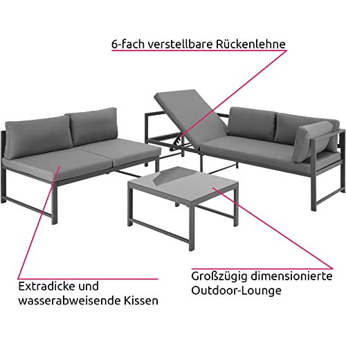 HOCHWERTIGE MATERIALIEN: Die pflegeleichten und wasserabweisenden Kissen und das stabile Untergestell aus Aluminium machen dieses rostfreie Lounge-Set zur perfekten Outdoor-Garnitur.