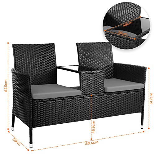 🎯2-Sitzer Gartenbank: Polyrattan Gartenbank mit integriertem Ablagetisch, ausgestattet mit 2 weichen und bequemen grauen Kissen, wenn die Kissen versehentlich verschmutzt werden, können Sie den Reißverschluss zum Reinigen, Trocknen und Wiederverwenden öffnen.